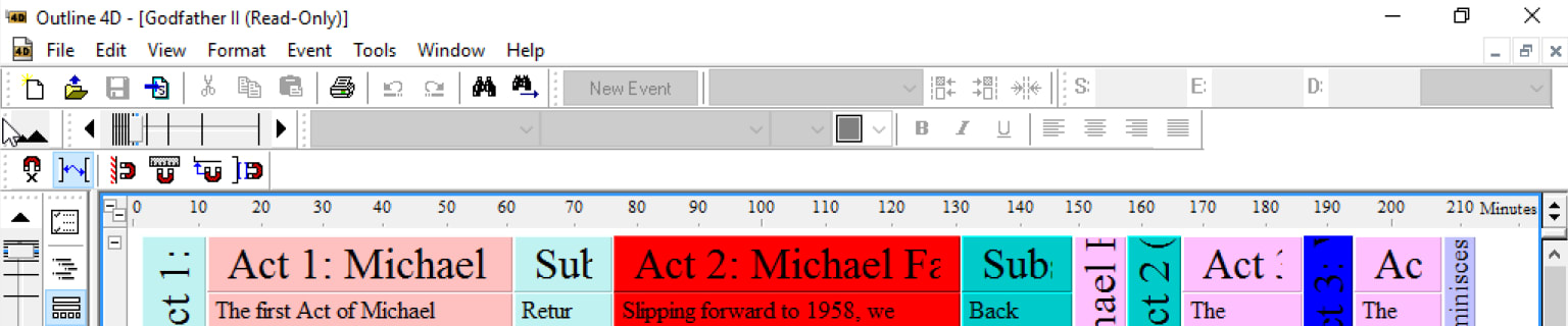 Outliner4D is so powerful that it would take several articles to explain all of its features. Outliner4D offers two major views: Outline and Timeline. The Outline is your typical top-down approach to outlining. You create nested lists of Acts, Sequences, and Scenes just like you would in any other program. The real magic happens when you switch to Timeline view.