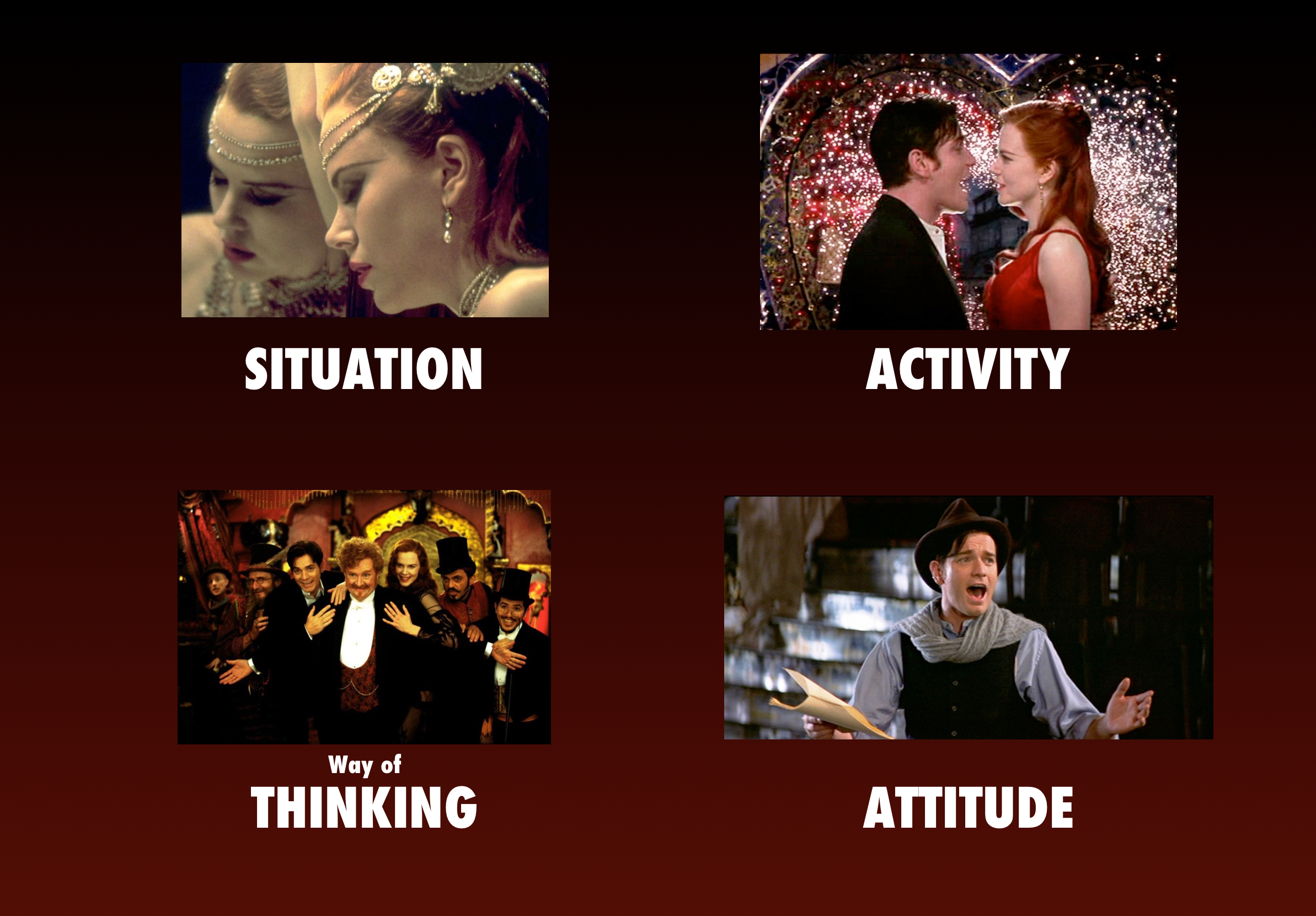 Finally we find the Objective Story Throughline, the throughline that involves everyone in the story--even Satine and Christian. But here we see them as the courtesan and the writer. The two, along with the theater owner, the money man, the bodyguards, and each and every performer, find themselves locked in dysfunctional Psychology as they attempt to bring back to life the Moulin Rouge! Manipulating the money man and the patrons that attend out of their wealth generates the global conflict in this story.